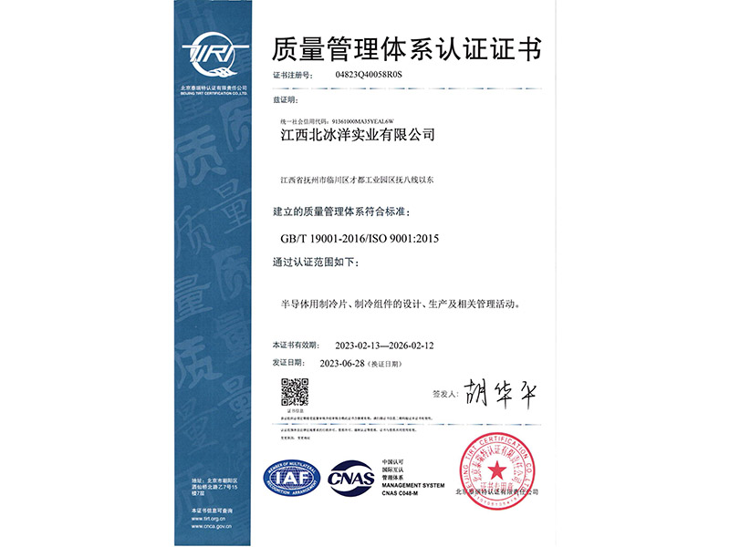 江西北冰洋實業有限公司創立于2017年,專業生產熱電制冷晶棒、晶粒、制冷片和制冷裝置,為客戶提供溫度控制方案設計,集研發設計、生產制造為一體,產品廣泛應用于航空航天、通訊、醫療、激光、工儀器、汽車、家電、消費電子等領域。公司的發展戰略是:立足半導體制冷及應用產品做出優質的品質,做出高性能和高可靠性能的產品。